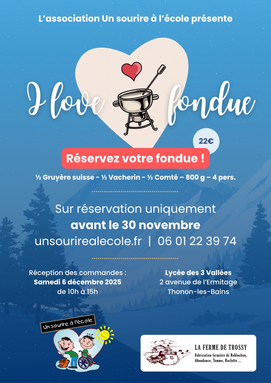 Réception des fondues au Lycée des 3 Vallées, 2 avenue de l’Ermitage, 74200 THONON, le Samedi 6 décembre 2025 de 10h à 15h.